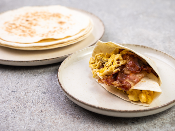 Umešana jajca z bučnim oljem in slanino v tortilji